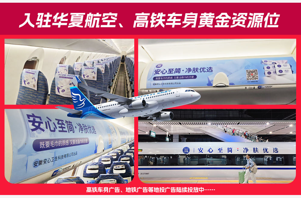 我公司“安心至簡”品牌入駐華夏航空、高鐵車身黃金資源位,更多高鐵車身廣告、地鐵廣告等地投廣告陸續(xù)投放中……